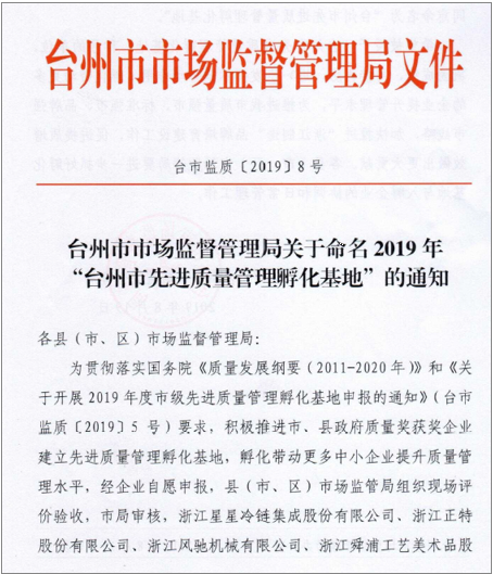 2019年8月19日,臺州市市場監(jiān)督管理局發(fā)布了臺市監(jiān)質(zhì)[2019]8號文件關(guān)于命名2019年“臺州市先進質(zhì)量管理孵化基地”的通知,我公司在2019年度臺州市級先進質(zhì)量管理孵化基地申報項目申報工作中,經(jīng)市場監(jiān)管局組織現(xiàn)場評價驗收,市局審核,同意命名為“臺州市先進質(zhì)量管理孵化基地”。