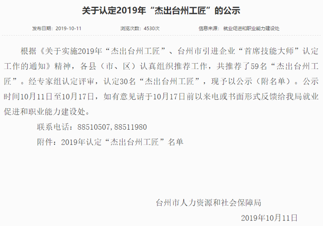 我司根據《關于實施2019年“杰出臺州工匠”、臺州市引進企業“首席技能大師”認定工作》的通知要求,通過公司推薦,資格初審,經專家組認定評審,我司研發中心工程師李軍輝成功順利入選被評選為“杰出臺州工匠”,并在網上予以公示,符合公司的價值觀“客戶為先、誠信負責、團隊合作、務實創新”精神。